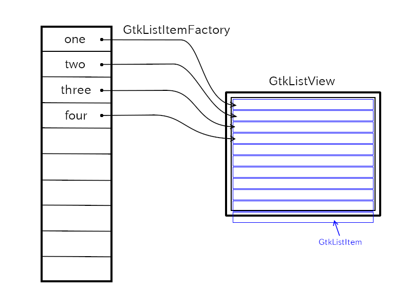 GtkListItemFactory creates or recycles GtkListItem and connects it with an item of the list model. There are two child classes of this factory, GtkSignalListItemFactory and GtkBuilderListItemFactory.